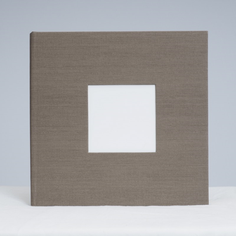 Album en tamaño 25x25 con tapa dura forrada en acabado lino,con 10 O 15 Hojas color beige y hoja de cristal separadora. en la tapa frontal va una ventana de tamaño 10x10 para poner foto en portada.
