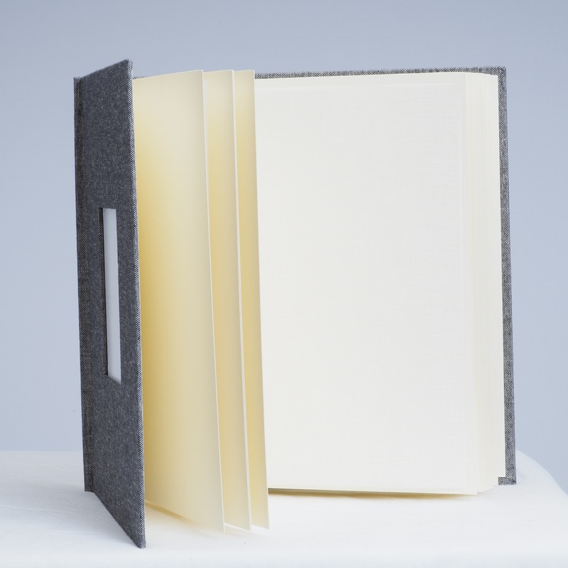Album en tamaño 25x25 con tapa dura forrada en acabado tela fina,con 10 o15 Hojas color beige y hoja de cristal separadora.en la tapa frontal va una ventana de tamaño 10x10 para poner foto en portada.