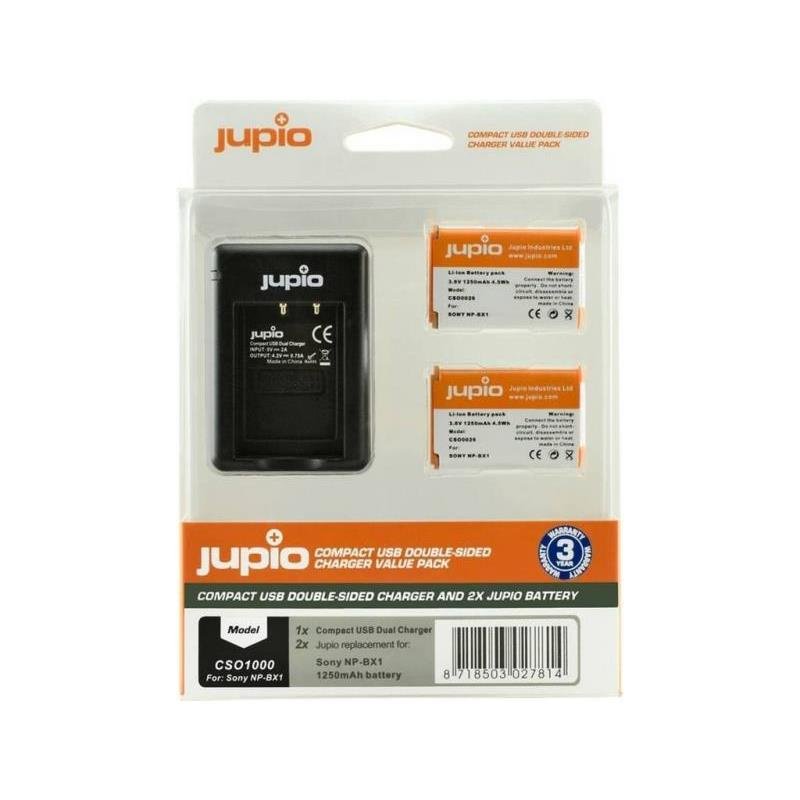 | Contenido del kit | 2× baterías NP-BX1 Jupio, 1× cargador dual USB, 1× cable USB, manual y embalaje. |