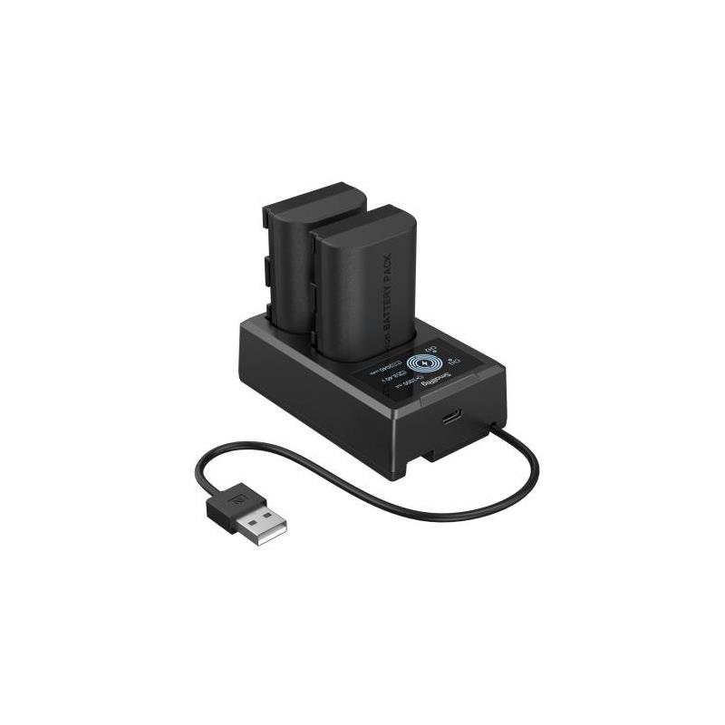 El cargador incluye indicadores LED inteligentes y un diseño portátil que lo hace ideal para sesiones en estudio, eventos, exterior o producciones de vídeo. La batería ofrece un rendimiento estable incluso en jornadas largas de trabajo.
