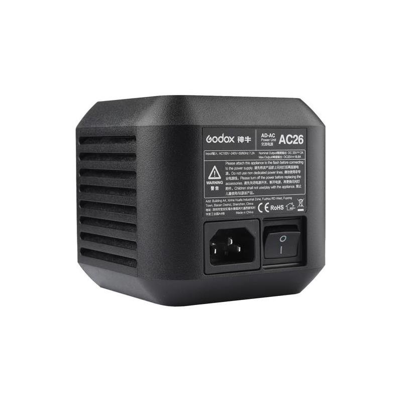 982812323Energía Ilimitada en el Estudio: El adaptador de red Godox AC26 transforma tu flash autónomo AD600 Pro en una potente unidad de estudio alimentada por corriente alterna. Diseñado específicamente para sesiones prolongadas, este accesorio elimina la dependencia de las baterías, garantizando que tu flujo de trabajo nunca se detenga por falta de energía.