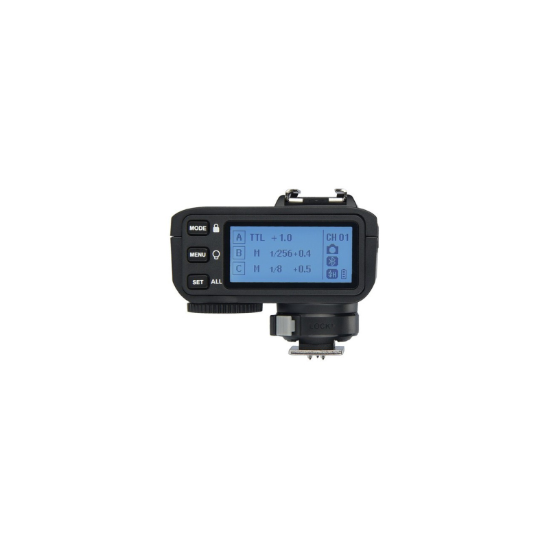 Trigger radio para flashes Canon modelo Godox X2T. Controla y dispara los flashes compactos, flashes de estudio y autonómos de Godox hasta una distancia máxima de 100 metros.