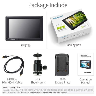 (1) Pantalla: 6" IPS pantalla táctil(2) 16.7M colores(8 bit)(3) 1920x1080 pixeles(4) Brillo 2600cd/m²(5) Input/output: 4K HDMI;(6) Pantalla tactil(7) Support HDR monitoring and User 3D LUT Upload(8) Bateria NP-F970