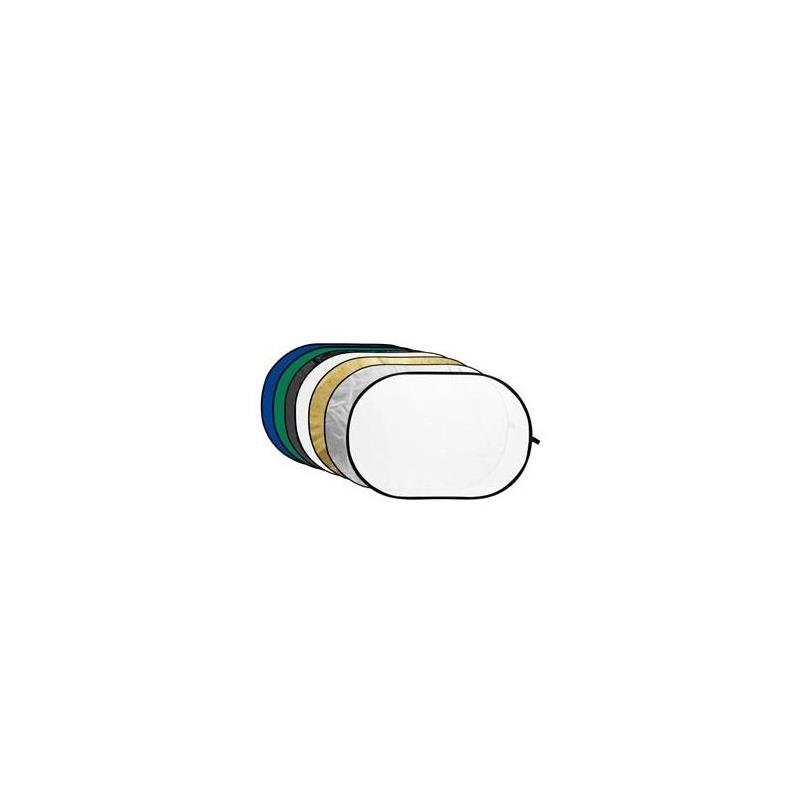 Godox Reflector 7-1 100x150 cm.. Se usa para rellenar sombras a fotos rostros y retratos de medio cuerpo. Diámetro abierto de 110 cm. Dispone de 7 colores: Negro, blanco, dorado, plateado, verde y azul. El centro blanco traslúcido difusor