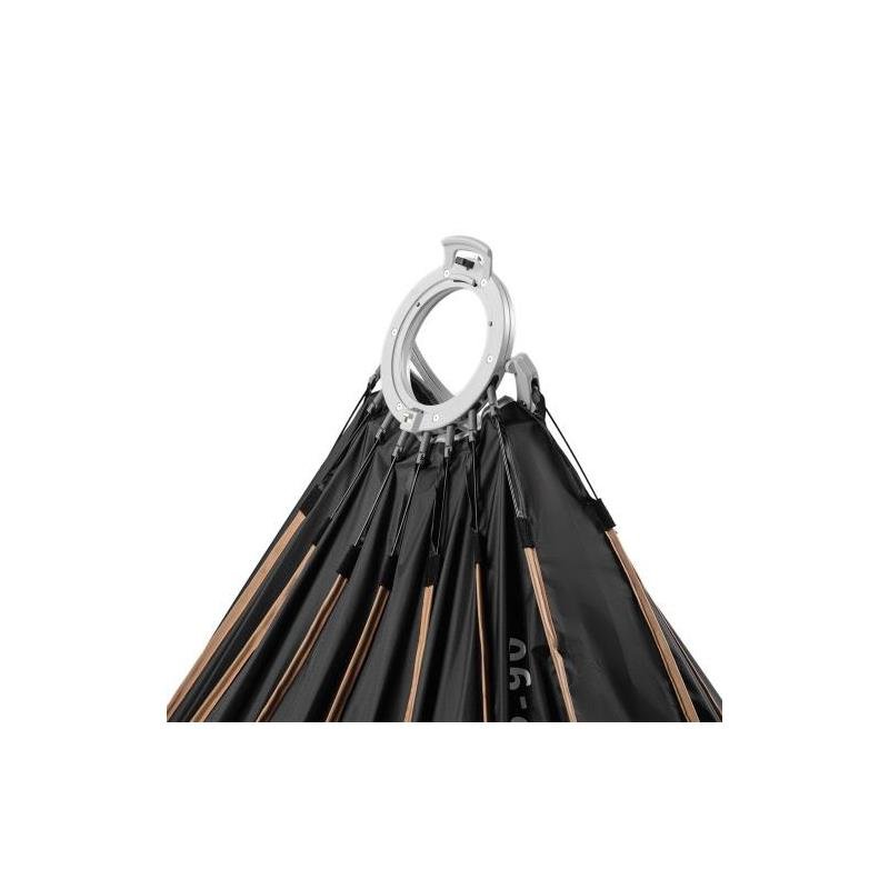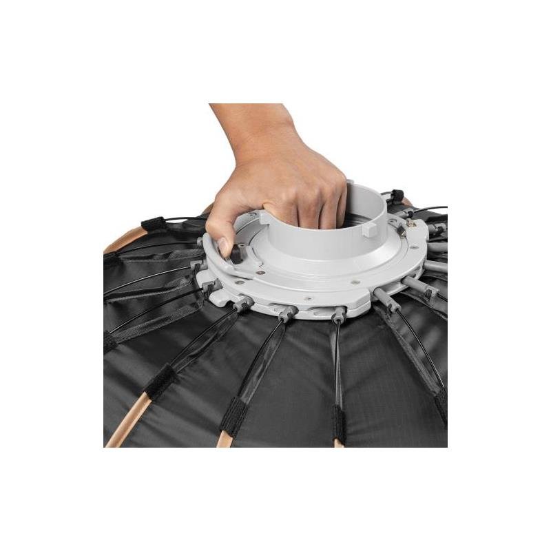 Con 140 cm de diámetro, su estructura está soportada por 16 varillas de acero. Su superficie interior reflectante en plata potencia la salida de luz, y sus dos difusores interno y externo son extraíbles. Este softbox parabólico genera una luz suave con bordes definidos, con apariencia de luz natural, idóneo para sesiones de retrato y moda.